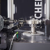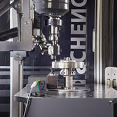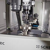 The machine consists of a vertical balancing device with an attached, automatically operating drilling unit. The body to be balanced is clamped on the balancing machine by means of a spring-force actuated receptacle that is pneumatically released. The measuring device CAB 870 is used for determining the unbalance and computation of compensation.